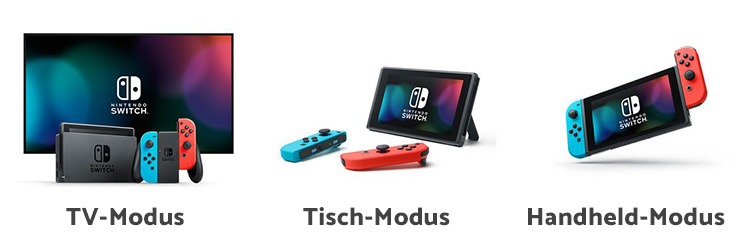 Die beste Grafik ist aber auch nicht das, was Nintendo mit der Switch erreichen wollte. Der eigentliche Clou der Konsole ist nämlich ihre Wandelbarkeit von der TV-Konsole zum tragbaren Gerät (Achtung: Das geht nicht mit Nintendo Switch Lite). Nintendo vermarktet die Standard-Switch mit drei möglichen Spielmodi: Im TV-Modus steckt die Konsole in der Dockingstation und ist per HDMI-Kabel mit einem Bildschirm verbunden. Der Spieler kann dann die Joy-Con-Controller abnehmen und wie ein klassisches Gamepad zusammenstecken. Die beiden anderen Modi funktionieren ohne einen zusätzlichen Bildschirm: Im Tisch-Modus wird die Switch-Konsole aufgestellt, während der Spieler die Joy-Cons in der Hand hält. Hier ist es sogar möglich, dass die beiden Joy-Cons unter zwei Spieler aufgeteilt werden, man also zu zweit an einer Switch-Konsole spielen kann. Im Handheld-Modus schließlich wird die Switch zu einem modernen Gameboy – dieser Modus ist am ehesten für Einzelspieler gedacht, die unterwegs zocken möchten. Das eigentliche Spielerlebnis ist in allen drei Modi gleich.